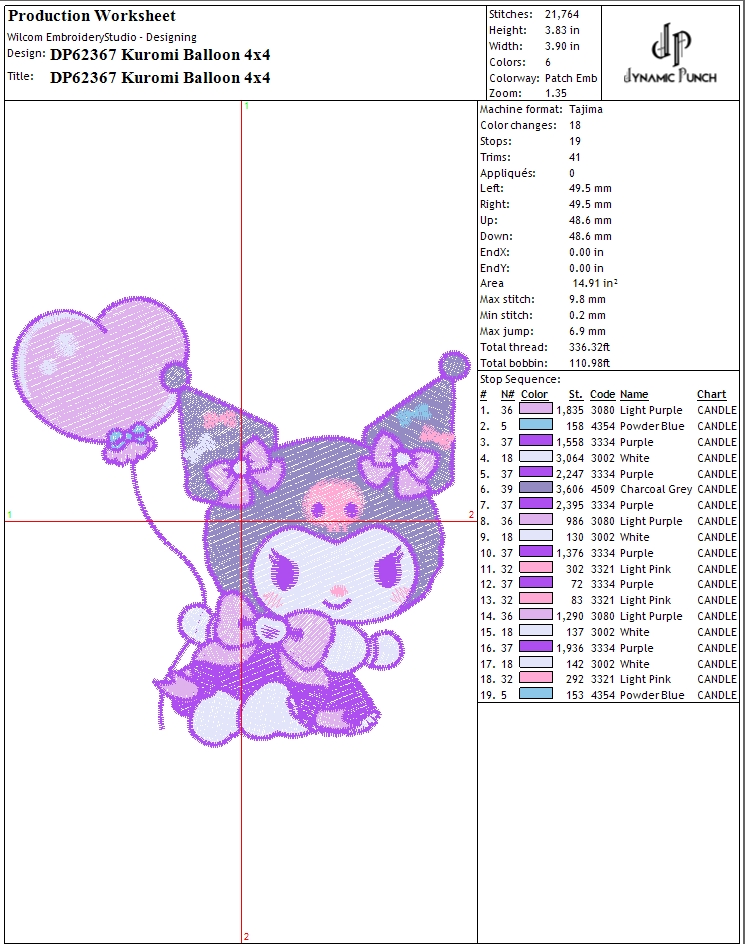 File Formats: DST, PES, JEF, HUS, PDF (Production Sheet).