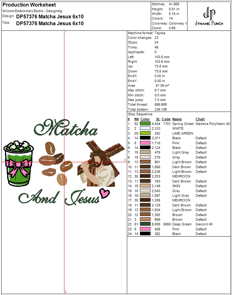 File Formats: DST, PES, JEF, HUS, PDF (Production Sheet).